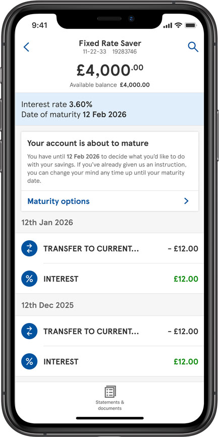 You can do this 48 hours after account opening by sending money via your bank account (different providers have different transfer limits). You’ll need your Fixed Rate Saver Sort Code and Account Number to do this – you’ll find this on your statement, your welcome letter or in Online Banking or the Mobile App.